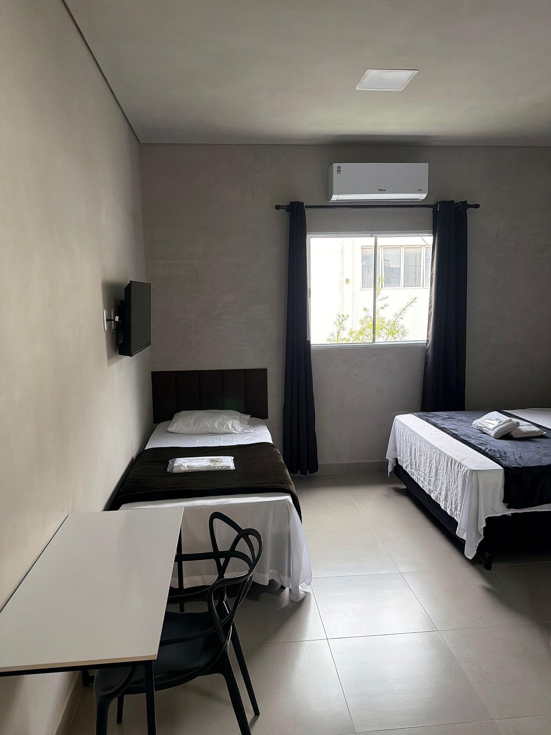 Hotel novo, com conceito de hospedagem prática e inteligente, ideal para quem busca conforto sem burocracia. O acesso é totalmente self check-in, com reconhecimento facial e portões independentes para pedestres e veículos. Os quartos estão disponíveis com cama de solteiro, casal ou casal + solteiro, atendendo diferentes perfis de hóspedes. Cada acomodação conta com: Banheiro privativo com água quente a gás, TV, escrivaninha funcional, armário, pia, copos e pratos, frigobar, roupa de cama e banho, Wi-Fi, 1 vaga de garagem O hotel também oferece uma copa compartilhada, com acesso livre aos hóspedes, equipada com geladeira, micro-ondas e máquina de café expresso com grãos moídos na hora. O hotel se inspira em metais e rochas por representarem elementos moldados pelo tempo, resistentes, autênticos e duradouros. Assim como esses materiais atravessam eras sem perder valor, cada suíte foi pensada para oferecer uma experiência sólida, confortável e atemporal. Tema: Metais & Rochas Essência: tempo, solidez, transformação e permanência.